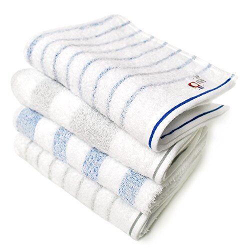 【フェイスタオル 4枚セット】サイズ:約32×79cm、約75g、綿100%、日本製(今治)。人気のボーダー柄で、カラーは全4色(ブルー・グレー・グリーン・レッド)。